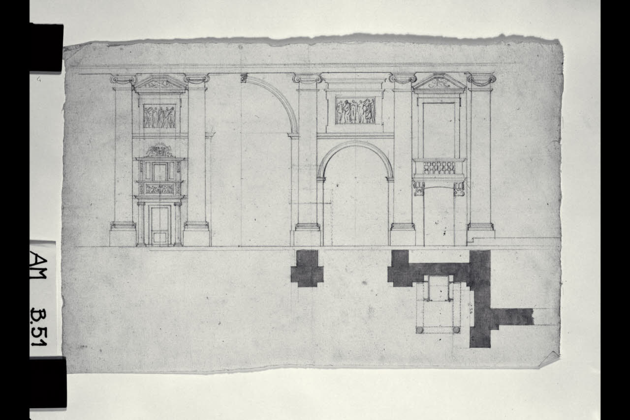 Pianta, prospetto e sezione longitudinale del pulpito della chiesa di S. Francesco di Paola a Milano. Pianta, prospetto e sezione longitudinale del pulpito della chiesa di S. Francesco di Paola a Milano
