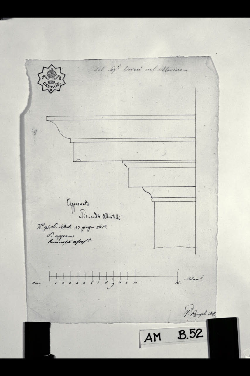 Prospetto di trabeazione per Casa Varesi a Milano (già Contrada del Marino 1139). Prospetto di trabeazione per Casa Varesi a Milano (già Contrada del Marino 1139)