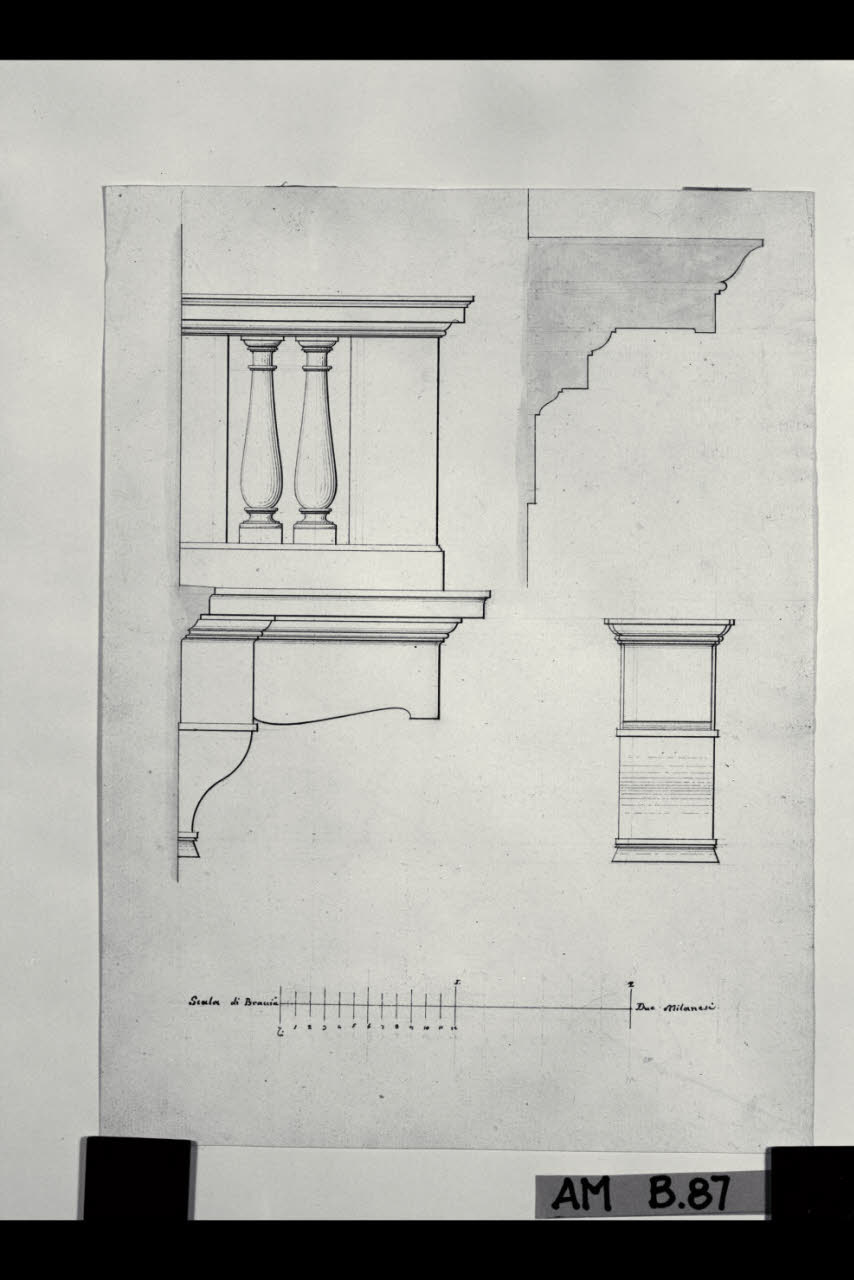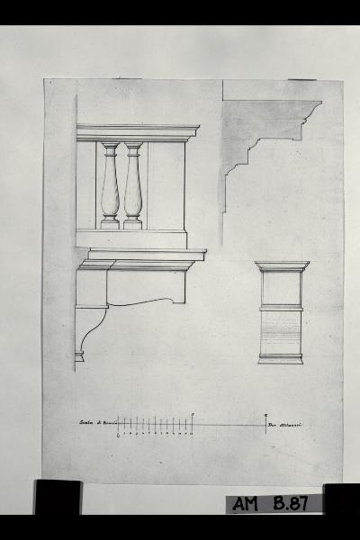 Prospetto laterale e sezione di balcone con mensola. Prospetto laterale e sezione di balcone con mensola