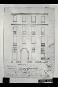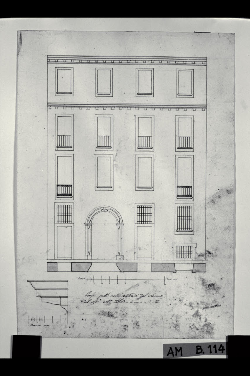 Pianta e prospetto della fronte della casa di Giovanni Battista Amati a Milano (già Contrada del Nerino 3362) con sezione della trabeazione. Pianta e prospetto della fronte della casa di Giovanni Battista Amati a Milano (già Contrada del Nerino 3362) con sezione della trabeazione