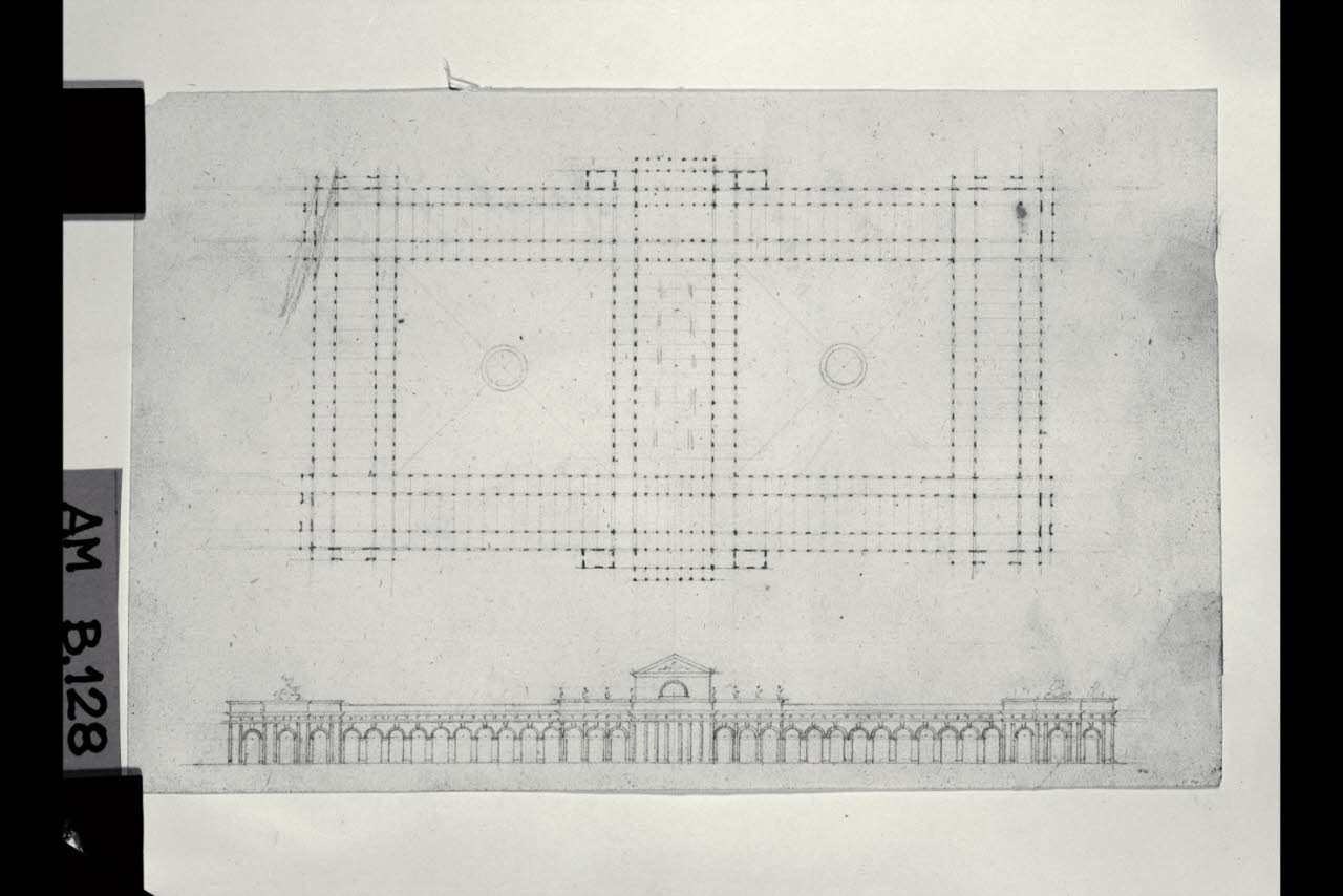Pianta e prospetto di edificio pubblico con fontane. Pianta e prospetto di edificio pubblico con fontane