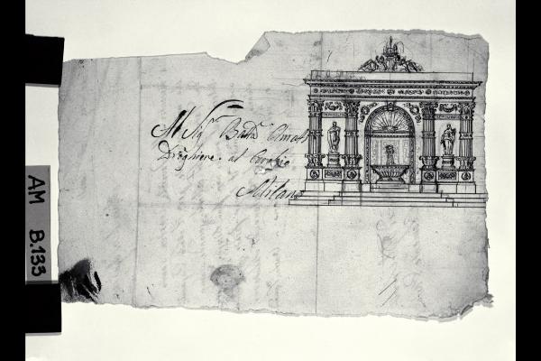 Prospetto di fontana monumentale addossata a parete. Prospetto di fontana monumentale addossata a parete