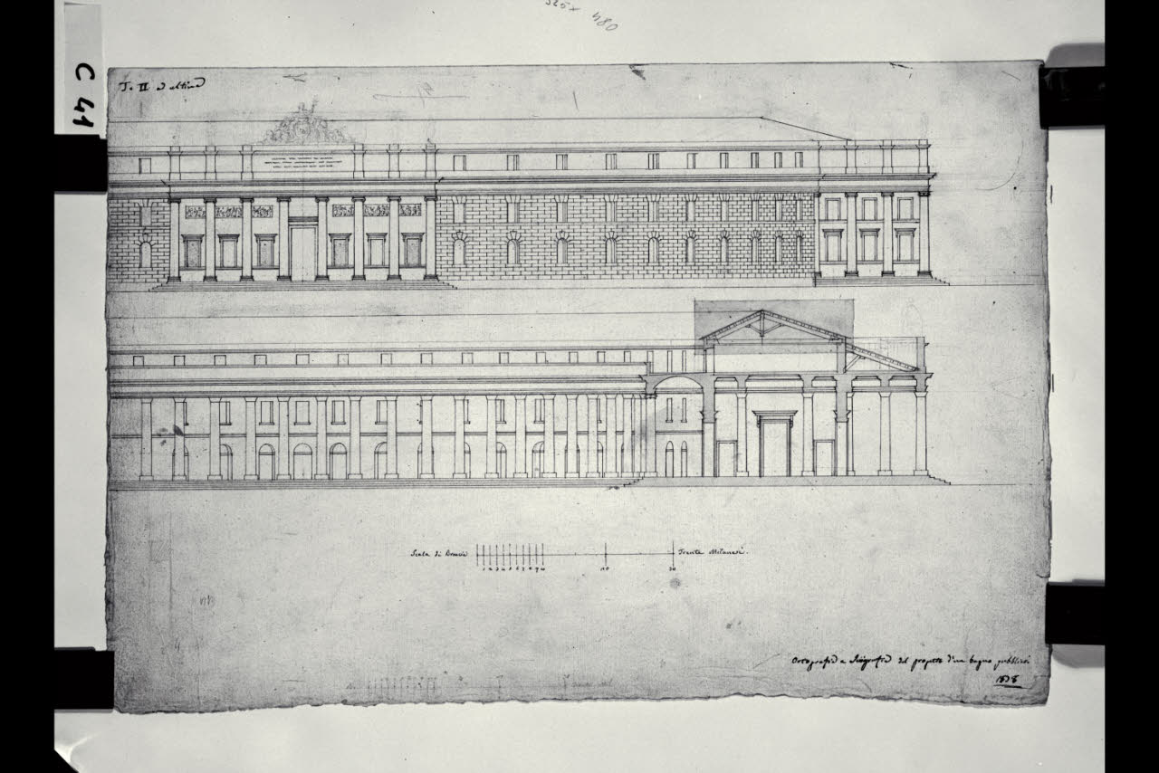 Prospetto e sezione di un bagno pubblico porticato. Prospetto e sezione di un bagno pubblico porticato