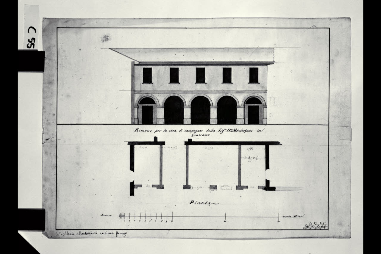 Pianta e prospetto delle rimesse di Casa Montorfani a Giussano. Pianta e prospetto delle rimesse di Casa Montorfani a Giussano