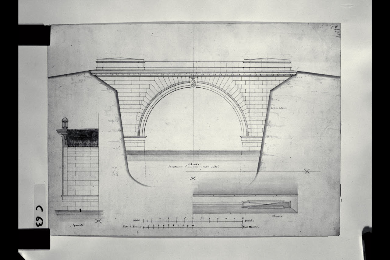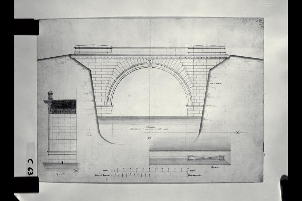 Pianta, sezione e prospetto di un ponte. Pianta, sezione e prospetto di un ponte
