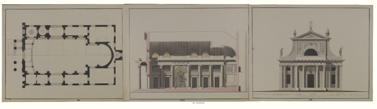 Pianta, sezione longitudinale e prospetto di chiesa con pronao tetrastilo e torre absidale. Pianta, sezione longitudinale e prospetto di chiesa con pronao tetrastilo e torre absidale