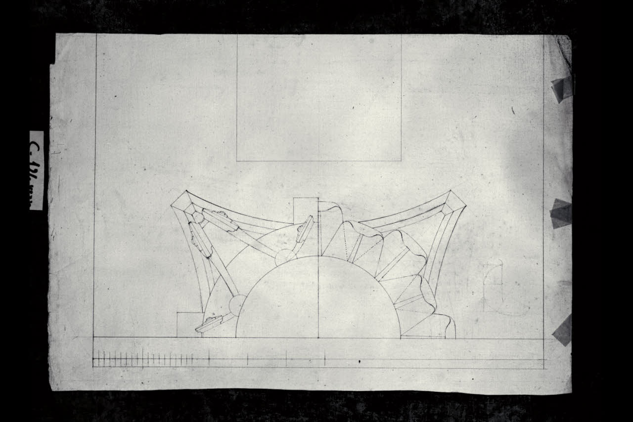 disegno eseguito a grafite e china su carta bianca; il corretto orientamento del foglio prevede la scala grafica a destra