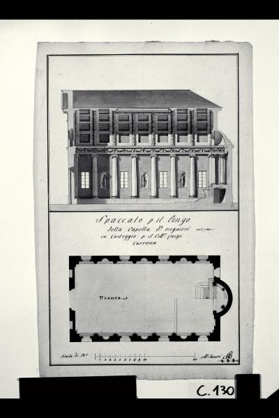 Pianta e sezione longitudinale dell'oratorio di S. Gaetano (Cappella Carrena) a Casteggio. Pianta e sezione longitudinale dell'oratorio di S. Gaetano (Cappella Carrena) a Casteggio
