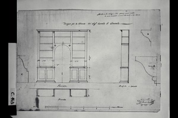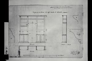 Pianta, prospetto e sezione di una libreria per la casa parrocchiale a Cornate d'Adda. Pianta, prospetto e sezione di una libreria per la casa parrocchiale a Cornate d'Adda