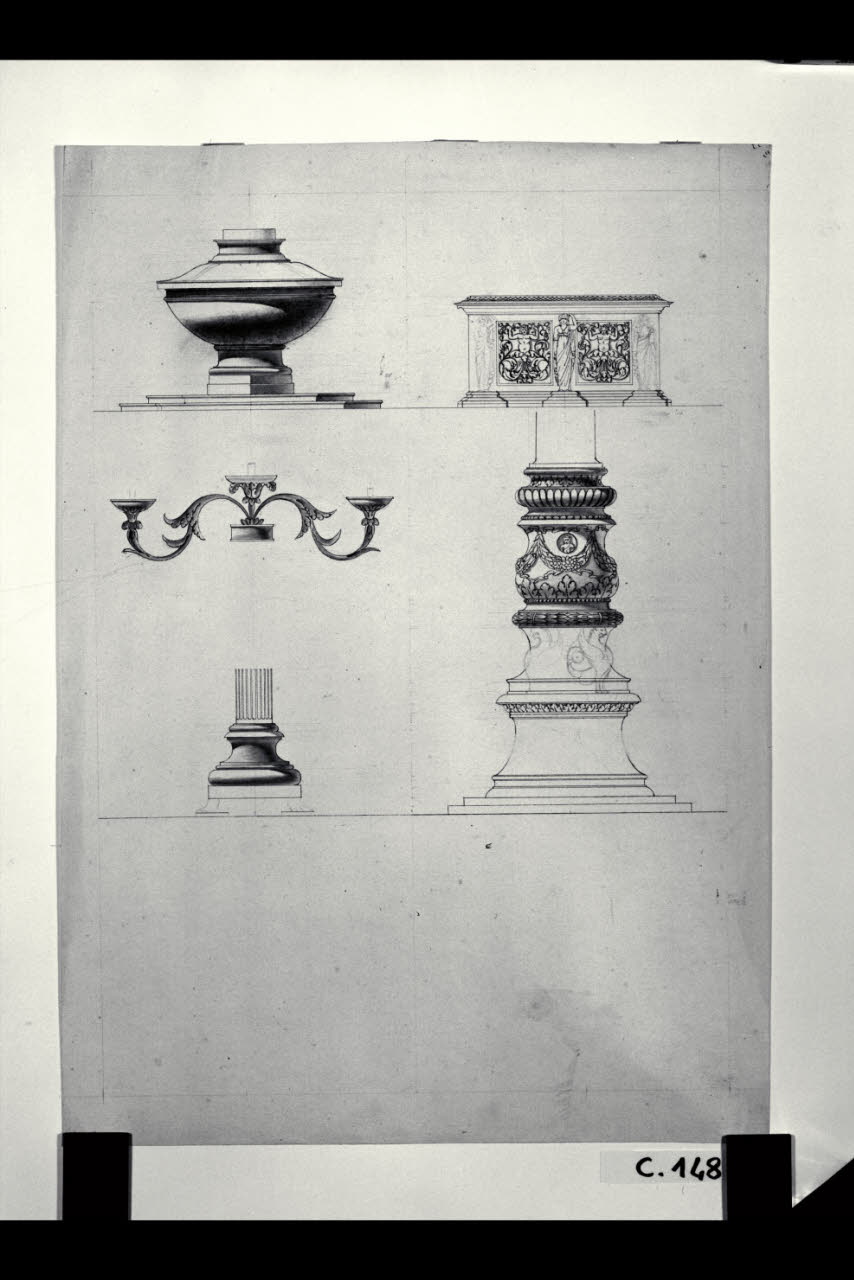 Prospetti di fonte battesimale, lampada, colonna a rilievi e piedistallo. Prospetti di fonte battesimale, lampada, colonna a rilievi e piedistallo