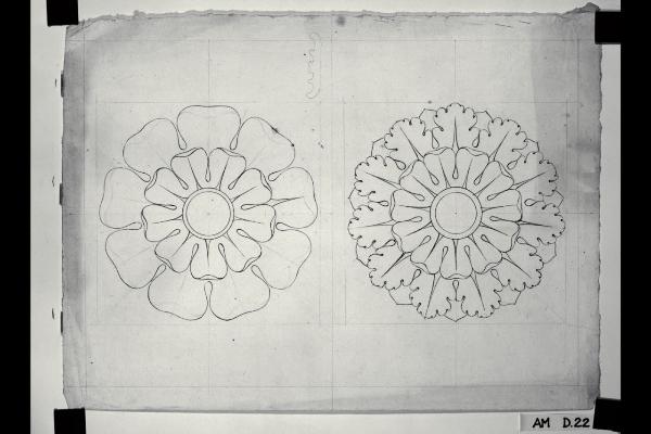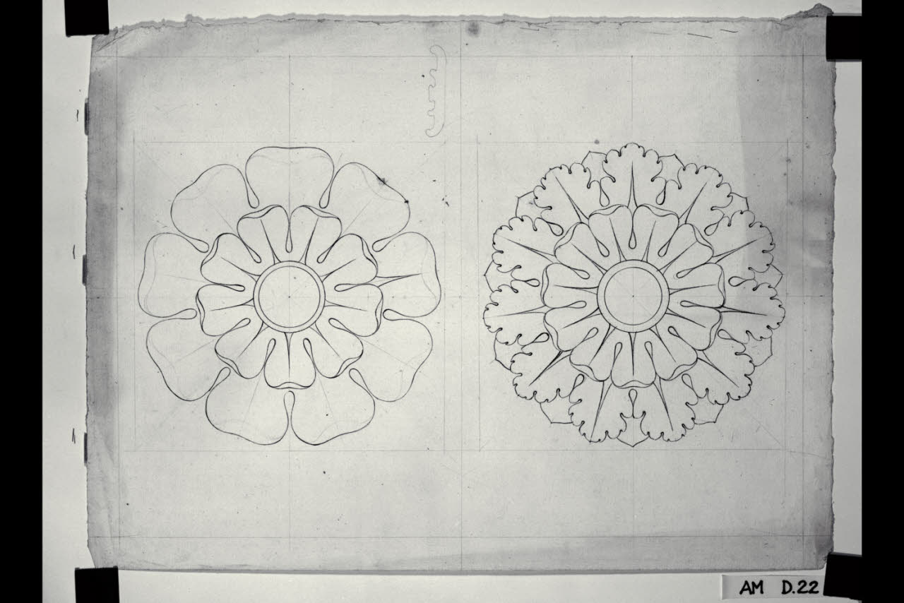 disegno eseguito a china e grafite, con linee di costruzione a grafite, su carta bianca