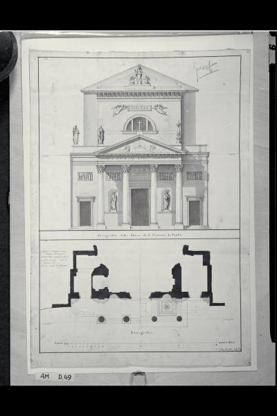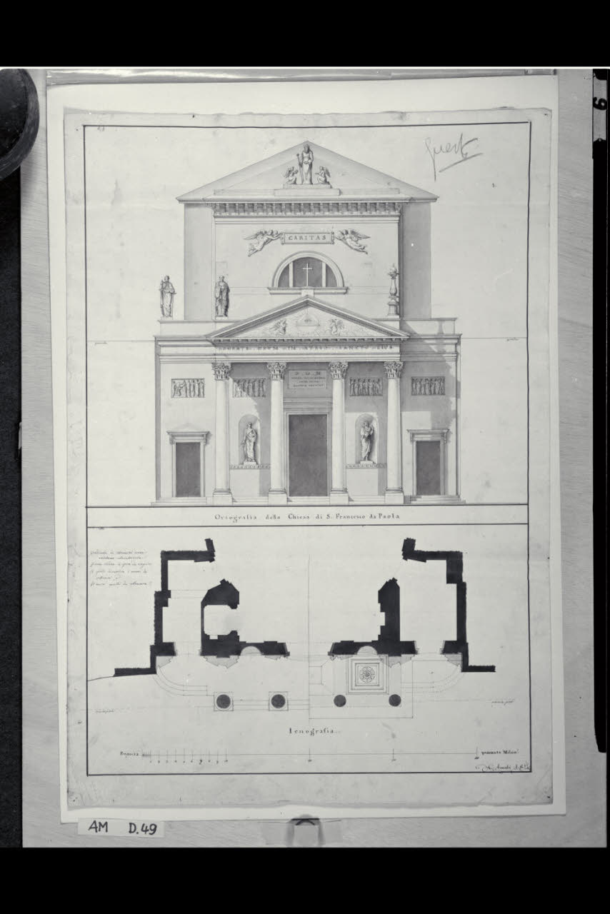 Pianta e prospetto della fronte e della scalinata della chiesa di S. Francesco di Paola a Milano. Pianta e prospetto della fronte e della scalinata della chiesa di S. Francesco di Paola a Milano