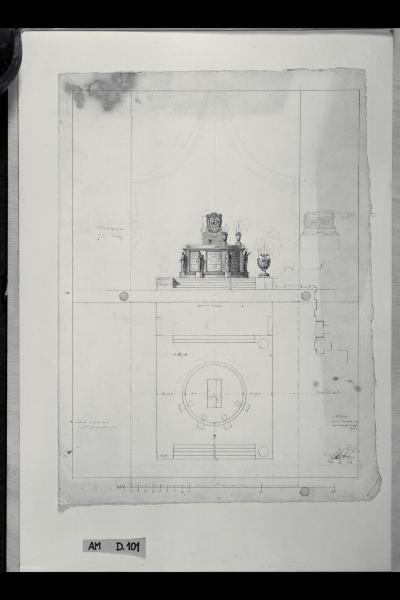 Pianta, prospetto e sezione longitudinale del catafalco per il conte Luigi Lambertenghi a Milano. Pianta, prospetto e sezione longitudinale del catafalco per il conte Luigi Lambertenghi a Milano