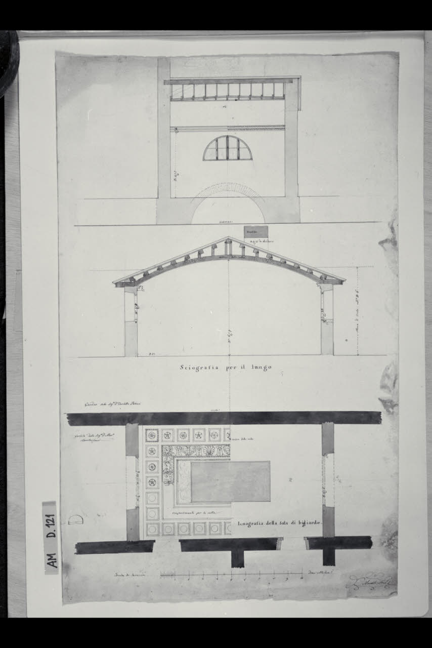 Pianta e sezioni della sala da biliardo di Casa Montorfani a Giussano. Pianta e sezioni della sala da biliardo di Casa Montorfani a Giussano