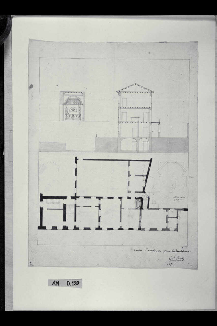 Pianta e prospetto del vano con vasca monumentale al primo piano di Palazzo Somaglia a Milano (già Strada de' Fatebenefratelli 1449). Pianta e prospetto del vano con vasca monumentale al primo piano di Palazzo Somaglia a Milano (già Strada de' Fatebenefratelli 1449)