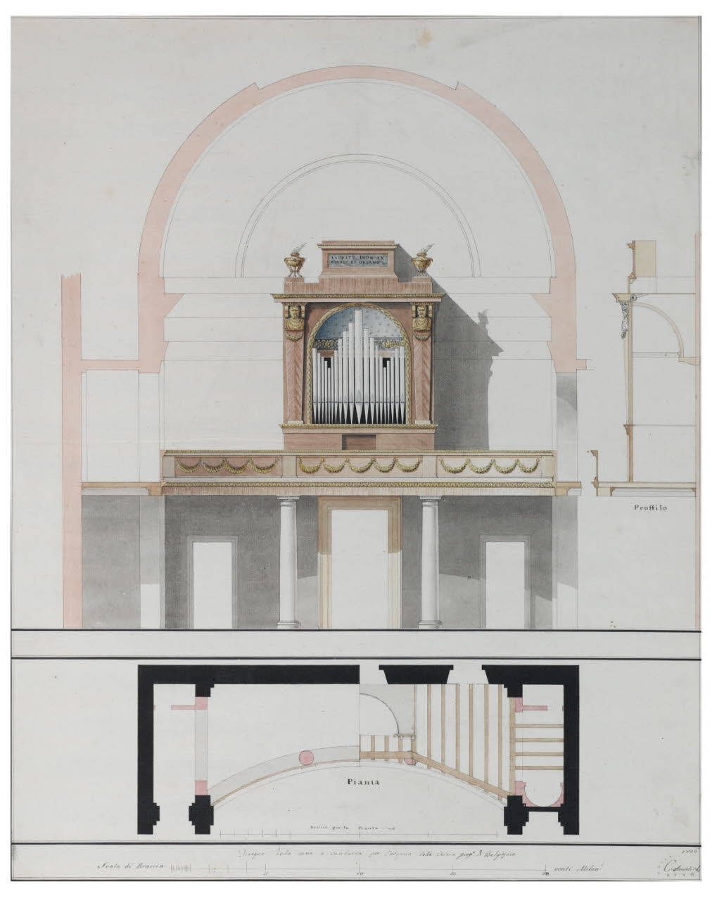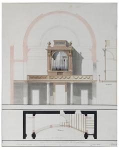 Pianta, prospetto e sezione dell'organo con cantoria della chiesa di S. Michele Arcangelo a Belgioioso. Pianta, prospetto e sezione dell'organo con cantoria della chiesa di S. Michele Arcangelo a Belgioioso