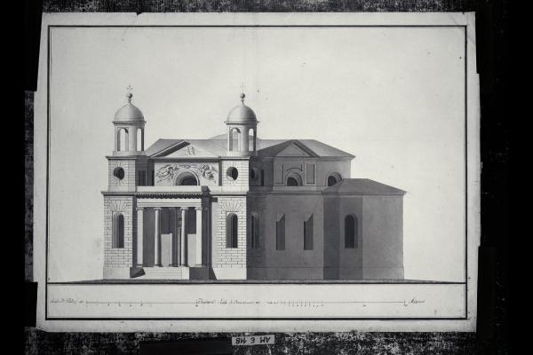 Prospetto frontale e laterale in assonometria di chiesa con pronao ionico e torri laterali. Prospetto frontale e laterale in assonometria di chiesa con pronao ionico e torri laterali