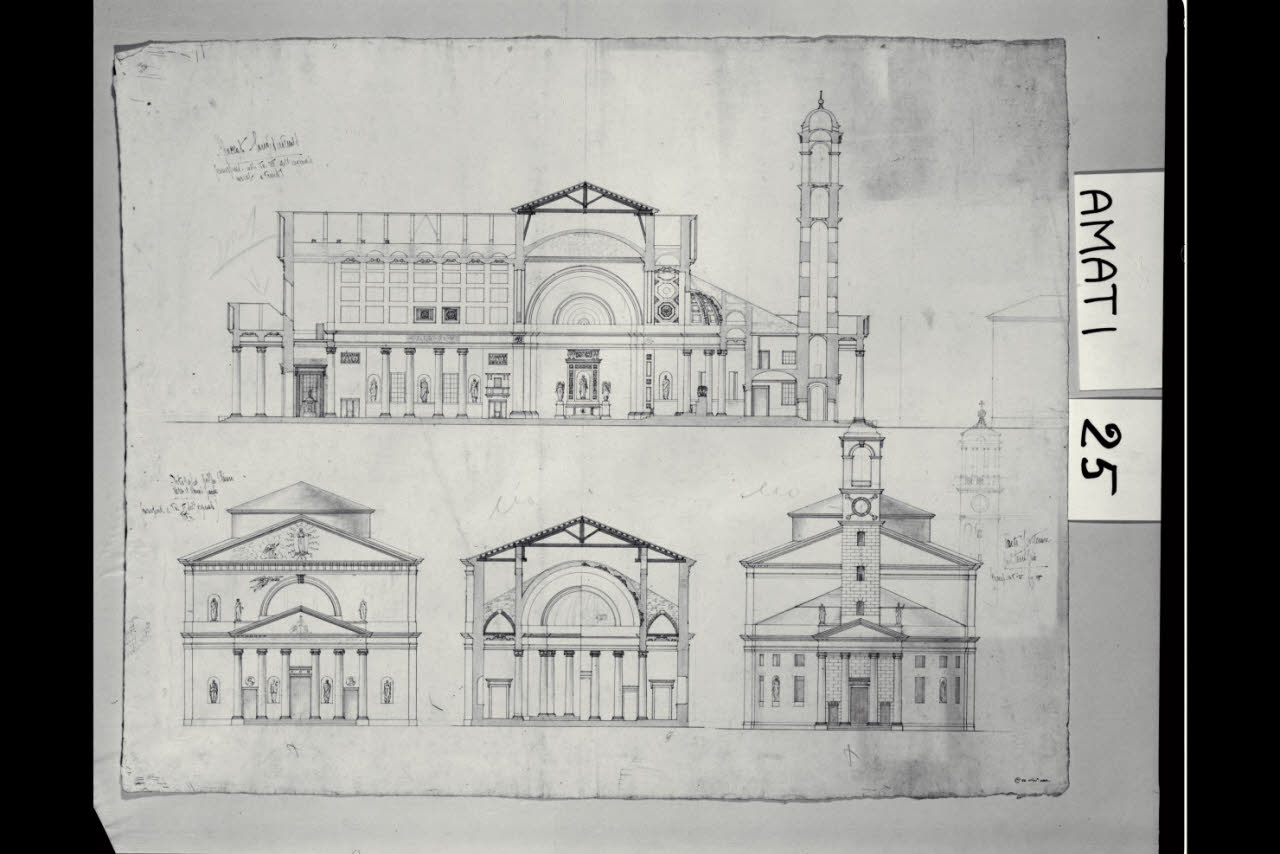 Sezione longitudinale, prospetto anteriore, sezione trasversale, prospetto posteriore della chiesa di S. Antonio Nuovo a Trieste. Sezione longitudinale, prospetto anteriore, sezione trasversale, prospetto posteriore della chiesa di S. Antonio Nuovo a Trieste