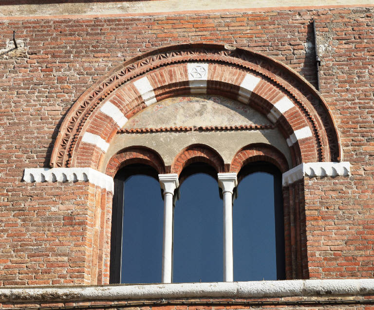 Trifora leggermente strombata costutita da ghiera modanata, lunetta con decoro plastico - pittorico e colonne.