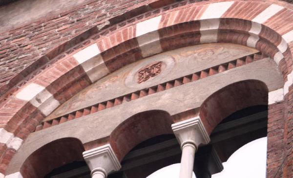 Cornice in cotto a dentelli sormontata da un medaglione polilobato decorato a rilievo con motivi vegetali stilizzati e circondato da un decoro pittorico.