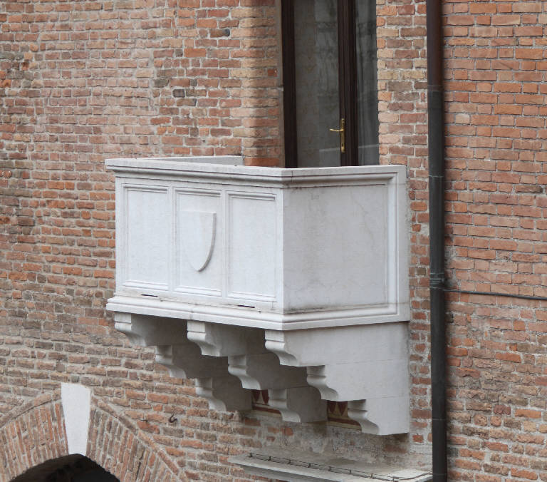 Balcone costituito da tre grossi mensoloni dal profilo modanato che sostengono una vasca quadrangolare con la fronte decorata da tre specchiature. La specchiatura centrale è decorata da uno scudo a rilievo.