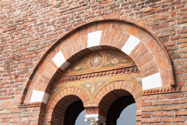 La ghiera costituisce il coronamento superiore della bifora ed è definita, lungo il profilo superiore, da una sottile cornice rilevata alla quale segue una fascia decorativa caratterizzata da una alternanza di conci in marmo bianco e mattoni. L'arco si appogia su due elementi quadrangolari decorati da motivi geometrici a rilievo.