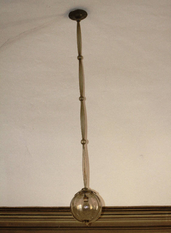 Lampadario costituito da una sfera portalampada sostenuta da un lungo braccio ricoperto da tre elementi di vetro leggermente bombati e raccordati, l'uno all'altro, da delle sfere.