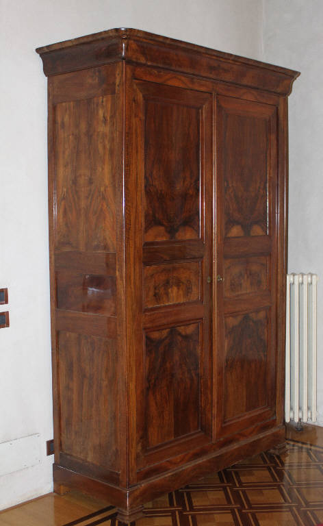 Armadio a doppio battente ciascuno suddiviso in tre specchiature definite da una cornice modanata, coronamento superiore leggermente aggettante.