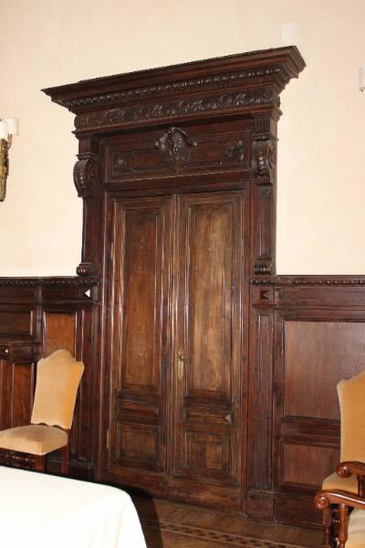 Porta composta da doppio battente ciascuno decorato da specchiature con cornice modanata e rilevata, da sovraporta con cartella a cartocci entro la quale è inserito uno scudo con stemma a rilevo. Il profilo superiore della porta e la sovrapporta sono compresi entro una cornice costituita da lesene dal profilo sagomato con capitello a voluta che sostengono una alta cornice architravata modanata ed aggettante, decorata a rilievo con girali vegetali, ovuli e dentelli.