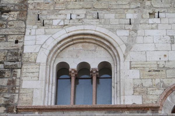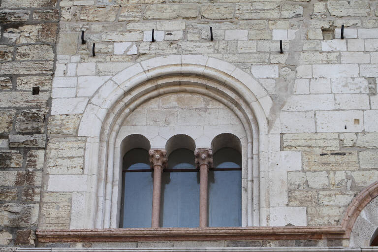 Trifora a tutto sesto con strombatura a fasci semicilindrici e mensolone aggenntante. Colonnine binate con doppi capitelli figurati che sostengono archetti a pieno centro.