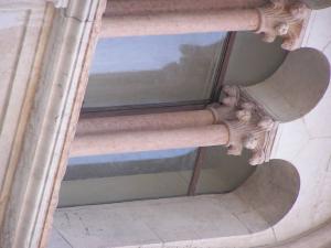 Colonna binata a fusto liscio, senza base, lievemente rastremata con doppio capitello tronco conoidale figurato.