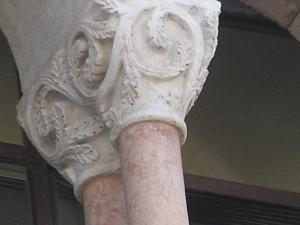 Capitello con abaco rettangolare e corpo troncoconoidale rastremato decorato a bassorilievo che si divide nella parte inferiore in due sezioni circolari.