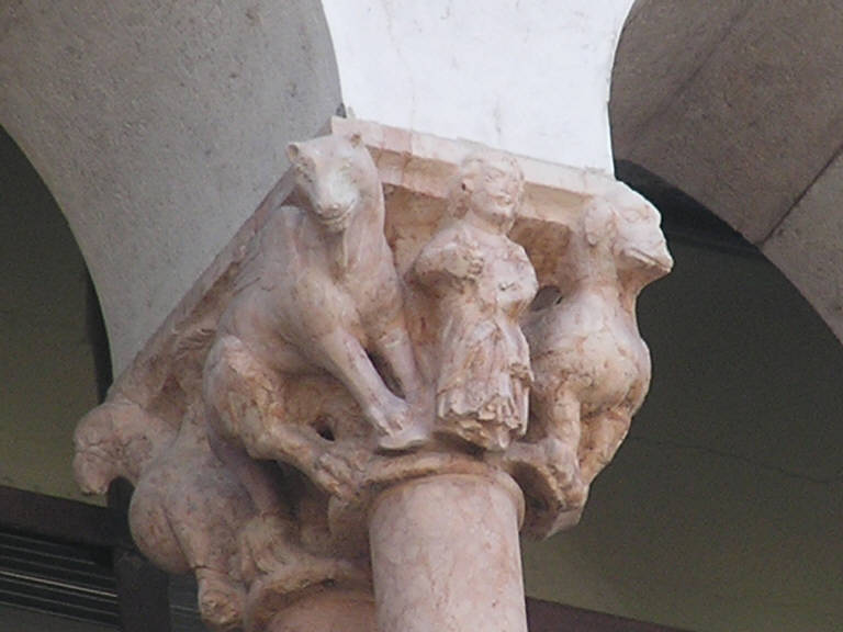Capitello con abaco rettangolare e corpo decorato da figure a rilievo che si divide nella parte inferiore in due sezioni circolari.