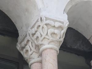 Capitello troncoconoidale a rilievo con doppio echino schiacciato e abaco rettangolare.