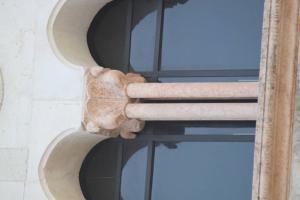 Doppia colonnina binata con fusto liscio, senza base e con capitello istoriato.