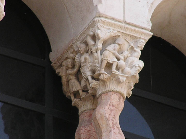 Capitello a tronco di cono rovesciato decorato ad altorilievo.