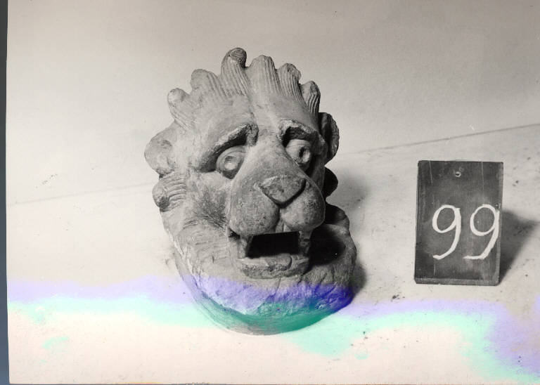 peduccio a forma di muso di leone; si presenta con le fauci aperte ma privo d'atteggiamento aggressivo. La criniera è suddivisa a ciocche. Le pupille sono ad incavo. Il muso è definito come una maschera, cioè non vi è definizione della testa