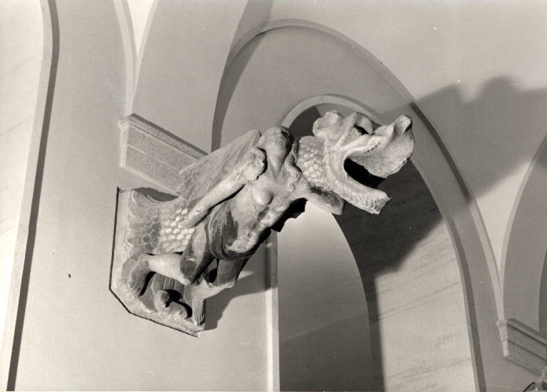 Doccione con forme di animale fantatsico con forma di drago alato. Avviluppata ad esso una figura antropomorma femminile nuda.