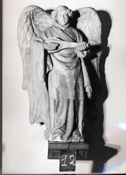 - NOTIZIE STORICO CRITICHE Proveniente dalla guglia 6, detta guglia Carelli che risulta da fonti documentarie già in costruzione nel 1390.\nLa critica ha attribuito con ragionevole certezza tale opera all'ambito borgognone. Tali maestranze risultano infatti presenti presso il cantiere della cattedrale in questo periodo.\nA tale proposito inevitabili i confronti con alcune opere come gli Angeli nel pozzo di Mosè realizzati da Claus Sluter tra la fine il 1395 e il 1406 nel chiostro della Certosa di Champmol a Digione e gli angeli provenienti dalla Cattedrale di Strasburgo\nOpera da metter in relazione dal punto di vista stilistico anchre con gli angeli che trovano posto nelle nicchie di uno dei capitelli del coro (pilone 81), la cui paternità sembra ricondurre probabilmente al medesimo scultore che realizzo "i francesissimi" angeli della guglia Carelli. \nLa Cavazzi, che attribuisce la paternità di quest' opera a Ronald de Banille, ne sottolinea le strette analogie stilistiche e dimensionali che caratterizzano le sopraccitate figure angeliche. Medesime sono le abbondanti vesti, identica l'acconciatura che raccoglie i vaporosi ricci ai lati della fronte, le guance carnose, eguali le imponenti ali che sembrano doversi spiegare da un momento all'altro e che sembrano ricondurre agli angeli della guglia Carelli.