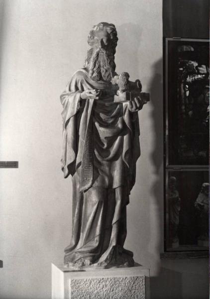 - NOTIZIE STORICO CRITICHE La statua proviene dal capitello del pilone 52.\nAttribuita dal Baroni alla scuola renana, questa scultura era stata proposta dalla Cinotti (cfr. catalogo del 1978), quale opera di un maestro italiano anche se, per i suoi caratteri stilistici, pare peraltro più verosimile optare a favore di un ambientazione teutonica, localizzata cronologicamente tra la fine del XIV secolo e il primo decennio del XV.\nI legami con l'arte renana nella delineazione fisiognomica del viso: i capelli, il contorno degli occhi, la linea della bocca inarcata verso il basso.
