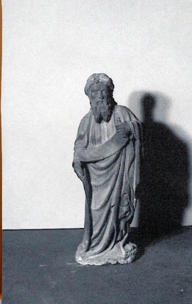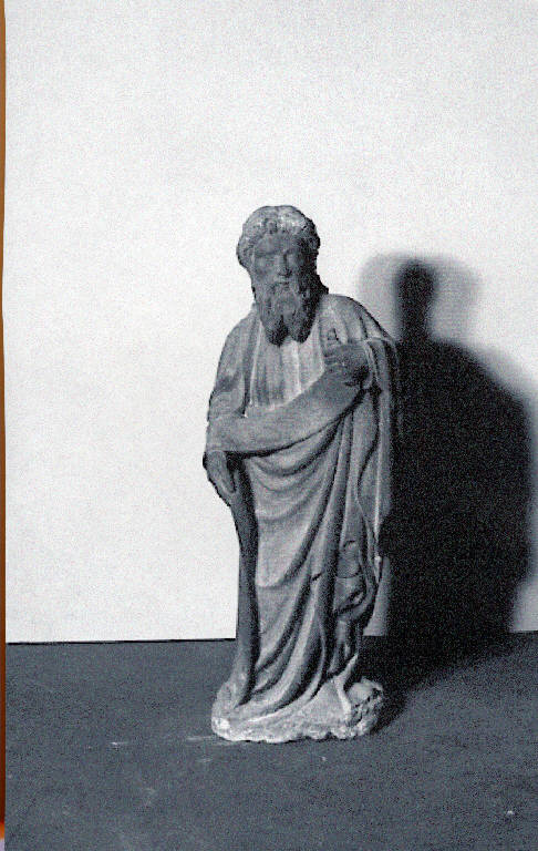 Uomo con barba lunga che nella parte terminale si presenta bipartita, la veste lo ricopre interamente fino ai piedi che non sono visibili. Il viso è leggermente ruotato verso sx rispetto al corpo. Tra le mani tiene un cartiglio srotolato che non presenta iscrizioni. La mano sx sorregge la parte terminale del cartiglio. L'estremità dx del cartiglio che prosegue fino ai piedi della statua, passa sopra il polso della mano dx, questa mano impugna un lembo della veste. \nPur essendo già definita la soluzione formale, la superficie presenta i segni della punta.\nSul retro al centro del busto è inserito, in un piccolo alloggiamento, saldato al marmo con piombo, il gancio d'ancoraggio in ferro, a sezione quadrata, al quale manca l'anello terminale.
