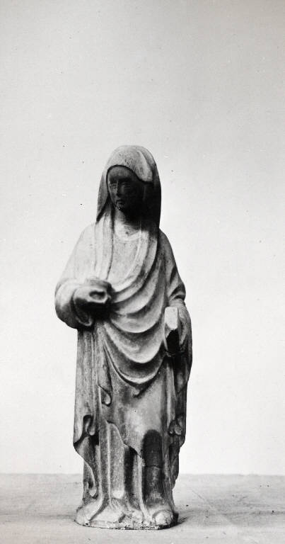 Donna velata, i lineamenti sono stilizzati, gli occhi incisi senza le iridi, il naso sottile, la bocca leggermente all'ingiù. Il capo è leggermente ruotato verso dx rispetto al corpo. Nella mano dx sostiene una scatolina, reliquiario?, con appoggiati due occhi, nella sx un libro chiuso. La veste lunga, arriva fino ai piedi e lascia intravedere la punta del piede sx, che indossa una scarpa chiusa.\nSul retro: la statua dalle spalle alla base non ha alcuna definizione formale, ma è quasi piatta e la superficie presenta i segni della sbozzatura.