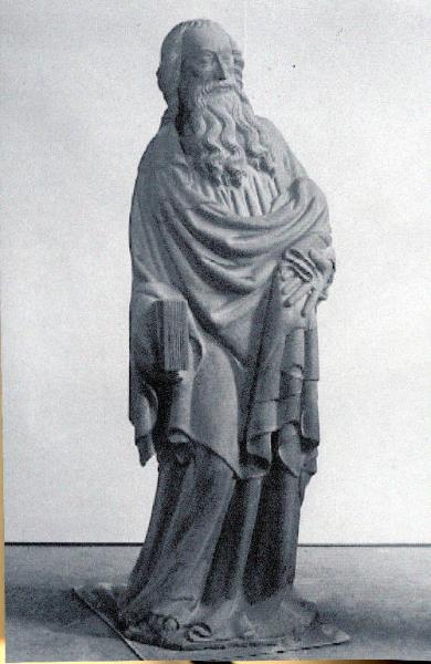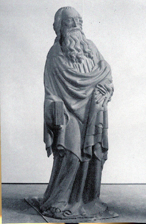 - NOTIZIE STORICO CRITICHE La Bossaglia (1978) lo inserisce in una stessa famiglia di statuaria di grandi dimensioni che asserisce essere di mano differente cioè il San Marco, San Taddeo, San Luca, San Giovanni.\nRisulta arduo poter attribuire un nome alla paternità della statua come già espresso in passato. Ad un attenta osservazione diretta si può asserire che il maestro o i maestri che fecero la scultura erano di provenienza renana. Il profeta presenta alcune similitudini nel S. Taddeo e nel S marco che sono : il grafismo dei capelli e della barba e quell'espressione corrucciata del volto. Il moto dell'anca nel profeta risulta però appesantito da una possenza fisica massiccia che si accosta a quella del S. Luca e che trova un punto di contatto nella fattura di mani grandi e quasi sproporzionate rispetto al resto del corpo. I maestri di ambito renano lavorarono in Duomo tra il 1390 e il 1410.\nProveniente dal pilone 53.