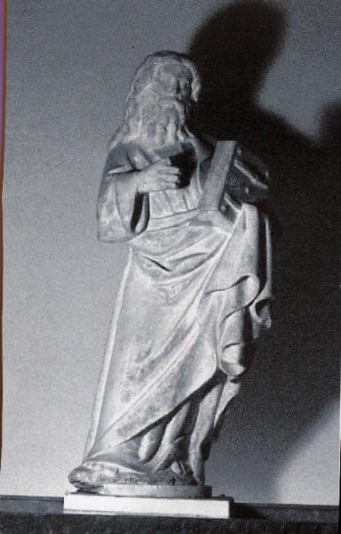 Uomo con capelli e barba lunga, lo sguardo rivolto verso il basso. Indossa una lunga veste che lascia scoperta la mano dx, e 4 quattro dita di ogni piede. Il corpo è inarcato vesro sx. La mano dx è nell'atto probabilmente di indicare qualcosa. La mano sx, velata dalla veste sorregge un libro chiuso. Il libro presenta una doppia chiusura.\nSul retro: pur essendo già definita la soluzione formale, la superficie non è levigata ma presenta i segni dello scalpello e/o della gradina tenuta ad angolo ampio rispetto ad essa (solchi brevi quasi incisioni a punta ma a distanza fissa) \nal centro del busto è inserito, in un piccolo alloggiamento, il gancio d'ancoraggio in ferro