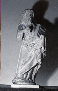 - NOTIZIE STORICO CRITICHE La causa della scarsità di documentazione e della quantità di scalpellini che lavoravano in quegli anni presso il cantiere, risulta difficoltoso attribuire l'opera ad un personalità distinta. E' invece individuabile, grazie a confronti di natura stilistica, il periodo e l'ambito al quale apparteneva lo scultore.\nCome lamentava Baroni, manca tutt'oggi una documentazione fotografica completa delle statue dei capitelli, che permetta di mettere in relazione i differenti stilemi presenti in cantiere nei primi anni che distinguono diverse nazionalità di maestri.\nTrattata da Russoli nel 1958 in occasione dalla mostra tenutasi nello stesso anno, che ne fece una scheda attribuendo la statuetta all'ambito borgognone e avvicinandola alla cin. 61. Egli inoltre la confronta con Andrè Beaneveu, scultore e miniatore francese.\nLa Bossaglia nel 73 e 78 non modifica l'opinione del Russoli. Mantenendo dunque l'attribuzione del Russoli, si ascrive il santo all'ambito della scuola Borgognona, e come già detto dalla Bossaglia, si sottolinea la finezza del modellato, soprattutto nell'espressione malinconica del viso, che si trova anche nella statuetta cin. 62 e nei particolari della chiusura del libro. \nProveniente dal pilone 53.