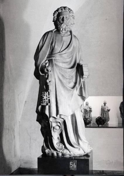 Figura maschile con barb a e capelli corti. indossa una lunga veste che lascia scoperte le punte delle dita dei piedi scalzi. sopra la veste un mantello. nella mano sinistra regge un libro chiuso, nella mano destra regge due chiavi legate insieme da un laccio.\nsul retro: l'opera si presenta finita nella parte inferiore, mentre nel tronco non vi è ancora alcuna soluzione formale, ma la superficie, piatta, presenta i segni dello scalpello e/o della gradina tenuta ad angolo ampio rispetto ad essa (solchi brevi quasi incisioni a punta ma a distanza fissa)