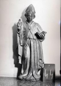 Figura mschile abbigliata da vescovo con mitra, piviale e razionale in atto di benedire, nella mano destra sorregge un libro aperto.\nSul retro: pur essendo già definita la soluzione formale, la superficie è parzialmente levigata: presenta i segni della punta\nal centro del busto è inserito, in un piccolo alloggiamento, il gancio d'ancoraggio in ferro saldato al marmo con piombo che sembra di epoca più recente: filo a sezione circolare, di circa 3mm di diametro, ripegato a formare l'anella