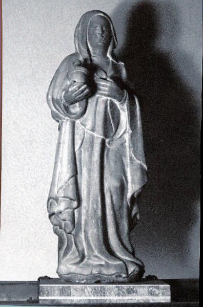 Figura femminile velata. nella mano destra sostiene una pisside.\nsul retro: pur essendo già definita la soluzione formale, la superficie non è levigata ma presenta i segni dello scalpello e/o della gradina tenuta ad angolo ampio rispetto ad essa (solchi brevi quasi incisioni a punta ma a distanza fissa) \nAl centro del busto è inserito, in un piccolo alloggiamento, il gancio d'ancoraggio in ferro saldato al marmo con piombo