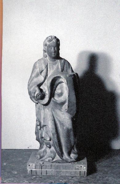 Figura maschile di giovane aspetto con capelli ricci. porta una lunga veste e tra le mani sostiene un cartiglio srotolato.\nsul retro: Pur essendo già definita la soluzione formale, la superficie non è levigata ma presenta i segni della punta grossa\nAl centro del busto è inserito, in un piccolo alloggiamento, il gancio d'ancoraggio in ferro saldato al marmo con piombo