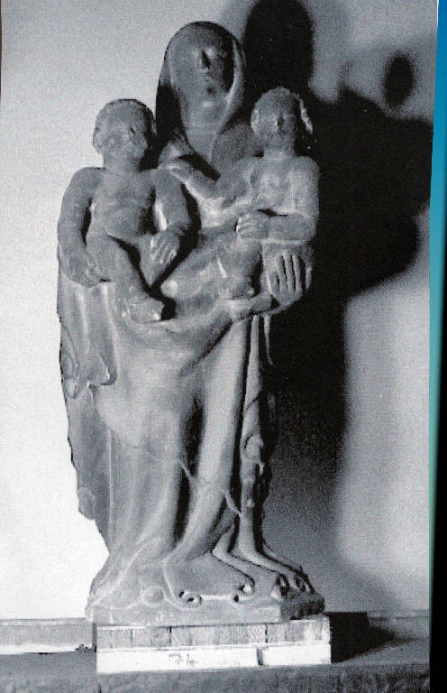 Figura femminile velata. In braccio ha due bambini gemelli.\nsul retro: l'opera si presenta finita e al centro del busto è inserito, in un piccolo alloggiamento, il gancio d'ancoraggio, al quale è ancora fissata la catena ( 4 anelli); il gancio è saldato al marmo con piombo; gancio e catena sono in ferro